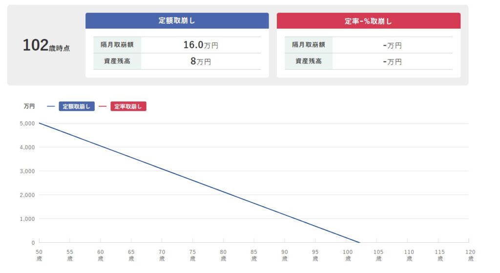 仮に、50歳から5000万円を運用せず、月に16万円づつ取り崩していったとしたなら、102歳まで資産は持ちます。