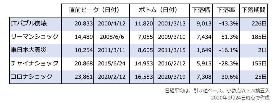 2000年から2020年までの間に○○ショックと呼ばれるものが起こった回数は5回。