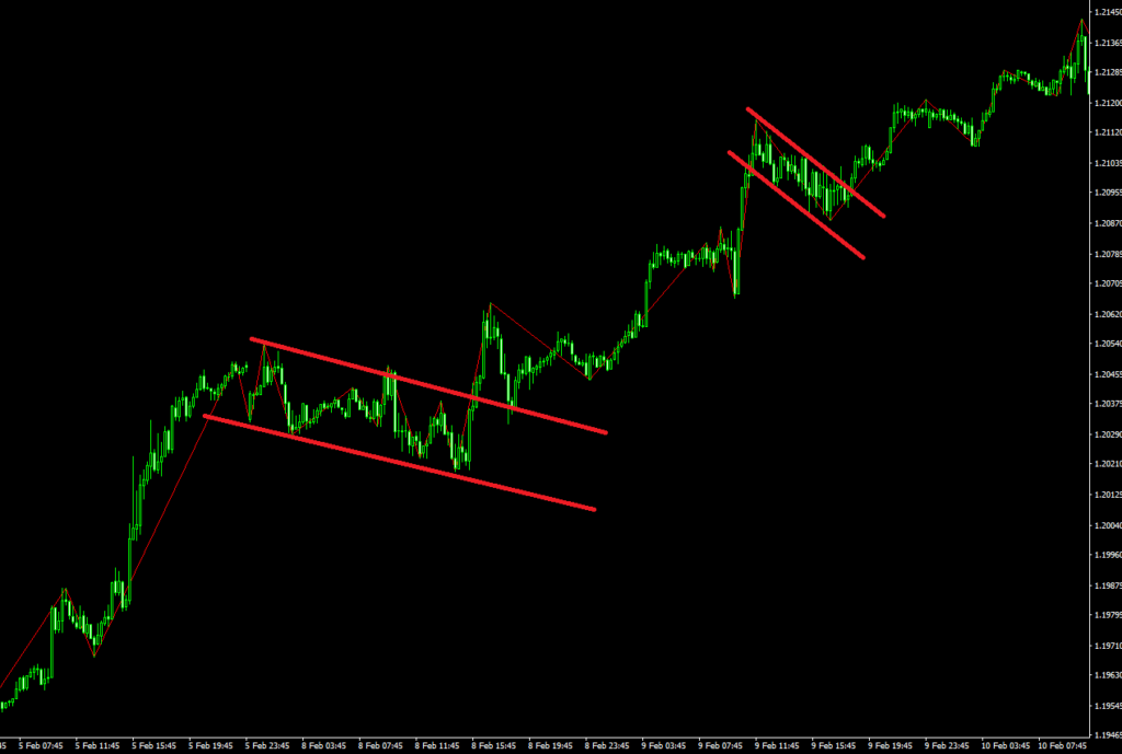 フラッグとの違いは、形もそうですが、下位足でみるとトレンドがでていません。