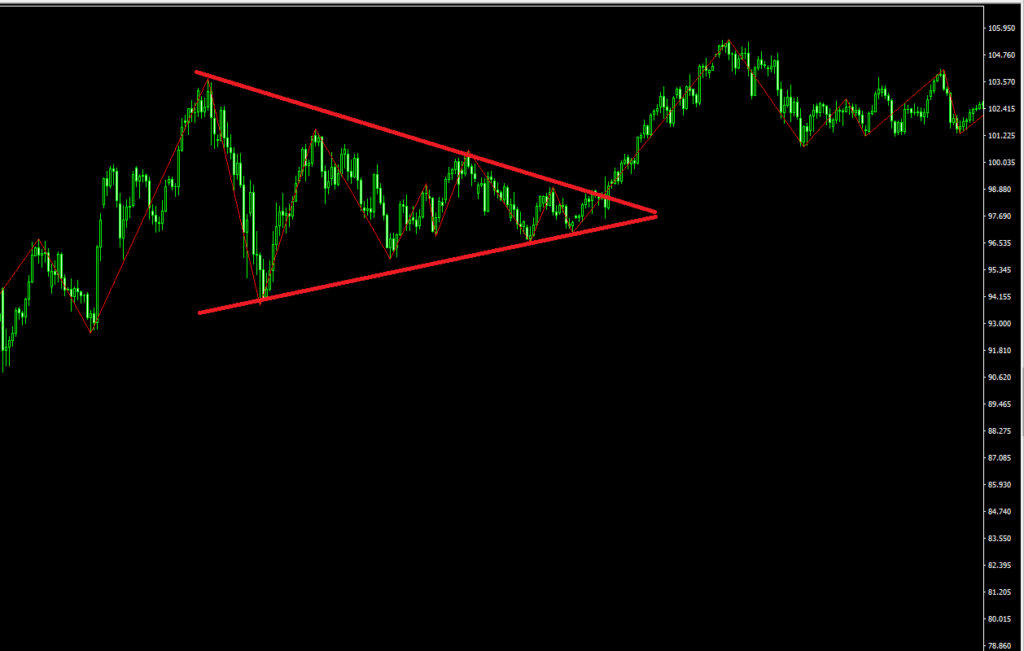 下のチャートは上昇トレンド中にペナントが発生しましたが、下落してしまいました。