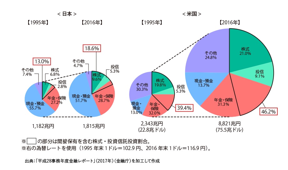 2016年でみると、株や投資信託などに投資している割合が、日本は約2割・米国は約5割と圧倒的に違います。