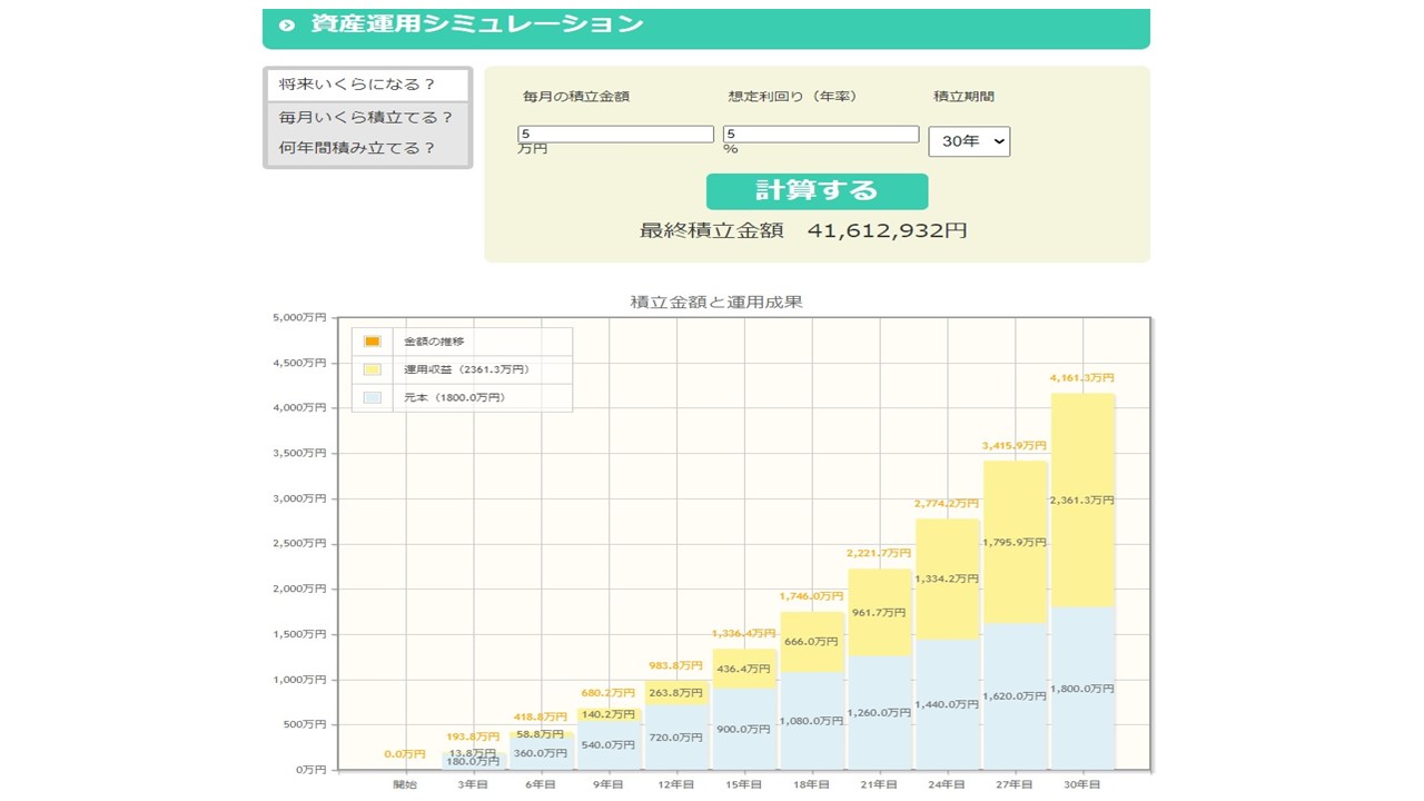 こちらは、月5万円を30年間(1800万円)投資した時のシミュレーションになります。