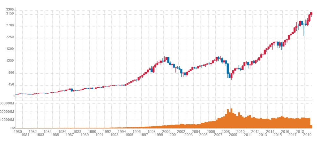 こちらは、S&P500の1980~2019年までのチャートになります。