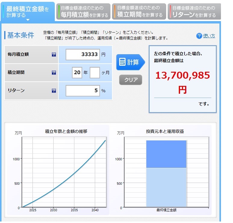 月に33,333円づつ20年、積立ていき5%で運用していくと約799万円が約1,370万円になるという物です。